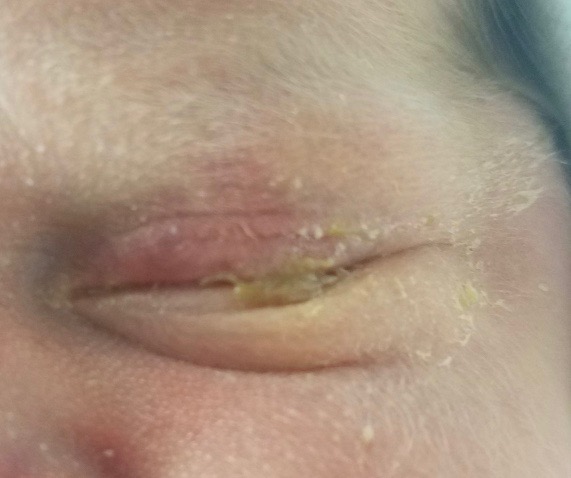 Picture above: erythema and edema can be seen covering the upper lid. Mucopurulent discharge observed between lids as well as diffuse yellow crust noted around the eye. Picture was taken just after wiping away discharge as it quickly began to reaccumulate (Picture taken with parental consent and parents consented to publication of picture).