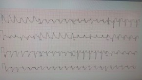 While waiting for transport the patient experienced a marked change in her cardiac monitor. EKG was obtained: