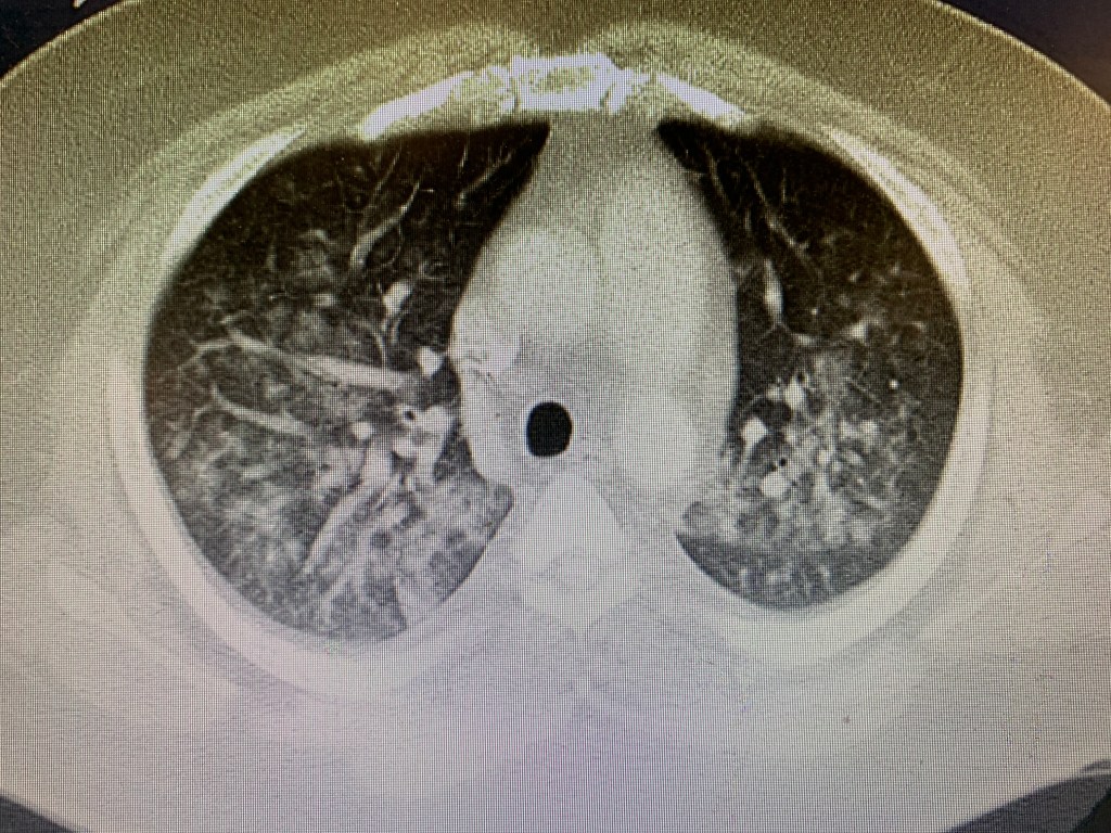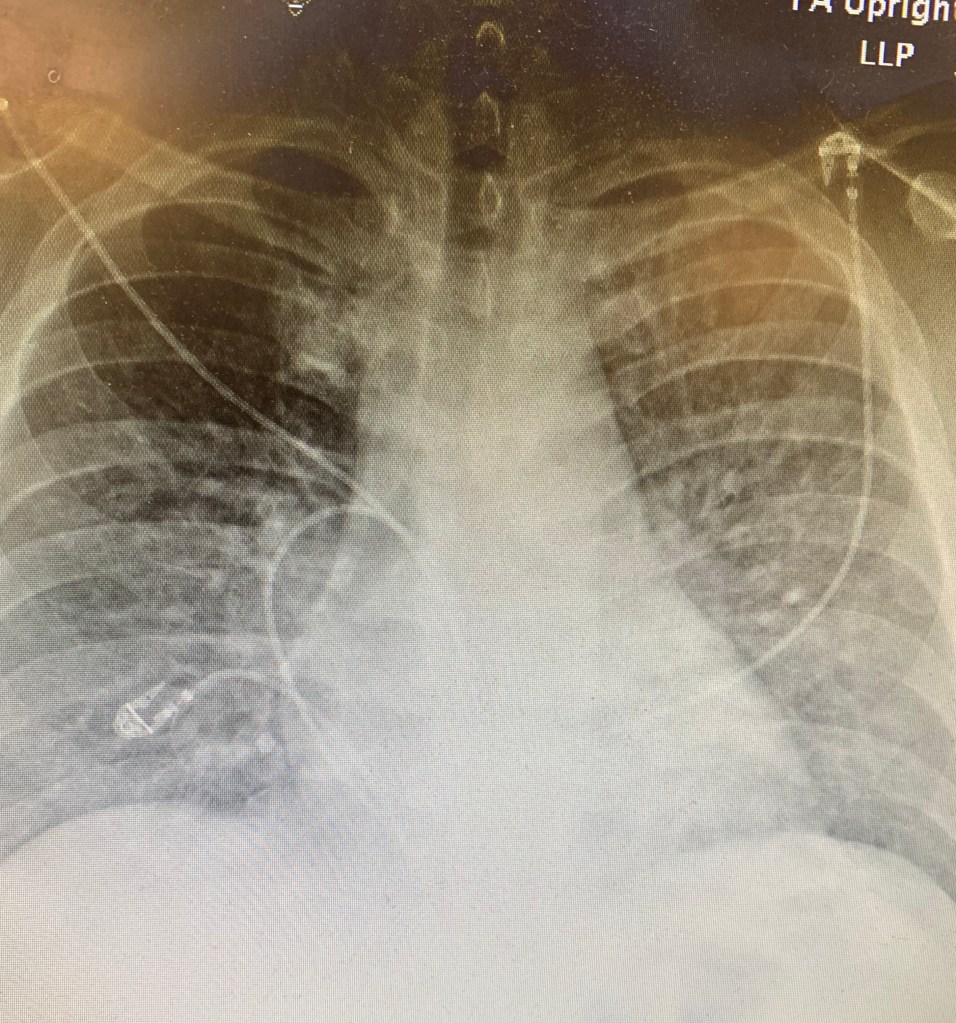 The CT shows multifocal pulmonary infiltrates diffusely throughout the bilateral lungs. An ABG is obtained on 100% FiO2 (the patient is placed on vapotherm prior to the ABG) and the PaO2/FiO2 ratio is 150. The patient is diagnosed with ARDS and multifocal pneumonia and admitted to the ICU.