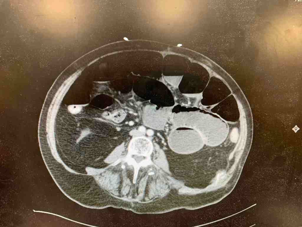 CT showed dilated loops of bowel with air fluid levels confirming the diagnosis of SBO. Surgery was consulted and the patient was admitted for further care.