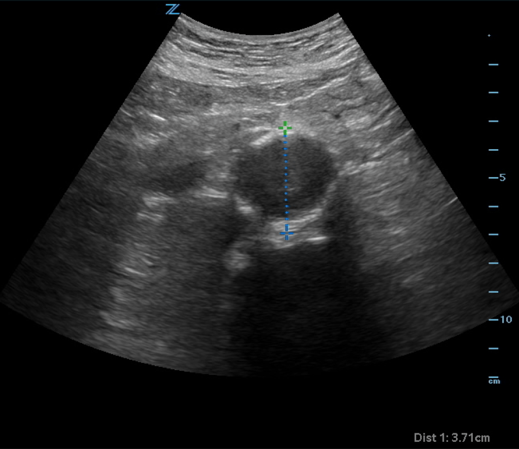 The ultrasound shows an enlarged aorta concerning for AAA, measuring at 3.71cm. However looking closely at the aorta, it almost appears as if there is a dissection flap with potentially two lumens on the ultrasound. You obtain color doppler: