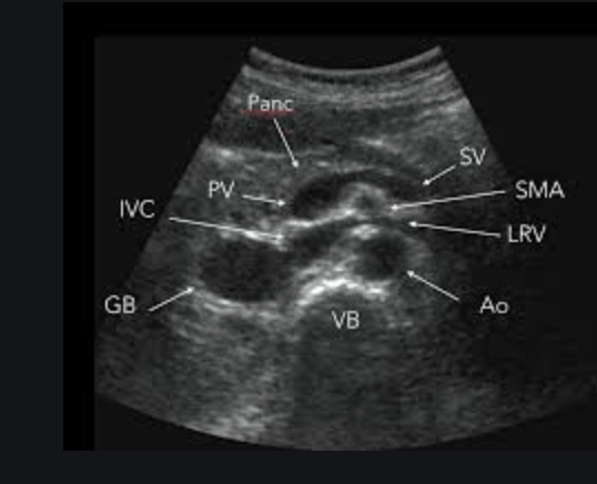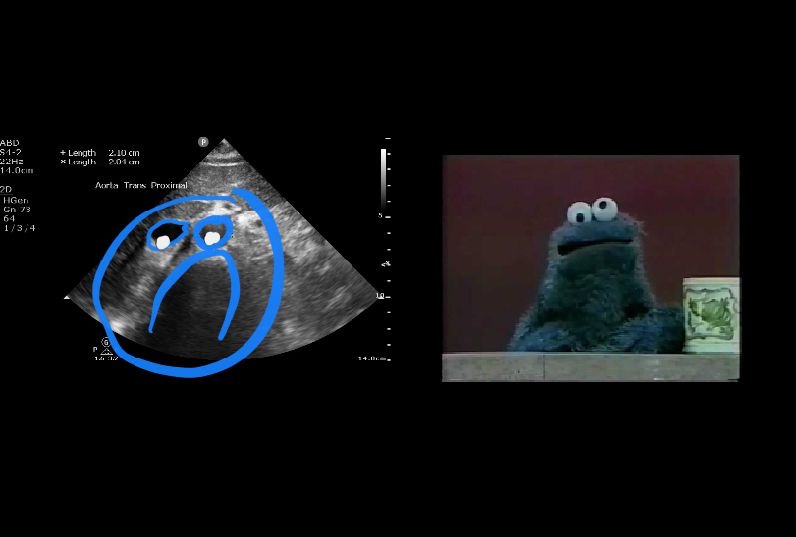 Identify the aorta based on anatomy, not on pulsatility or color flow (there are times where the IVC can appear to be pulsatile and may lead to misidentification). The aorta should appear as a “sad cookie monster” with the IVC and aorta making up the eyes, and the vertebral body making up the frown. You can identify the vertebral body as a hyperechoic “frown” with anechoic shadow behind it.
