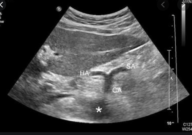 The celiac can be identified from the “seagull sign.” The celiac, hepatic artery, and splenic artery form a seagull shape.