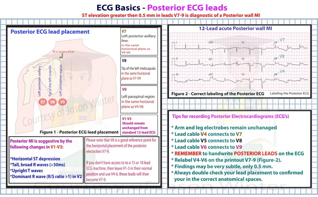 Three EKG leads are moved to the back (V4, V5, V6 are moved to the back) and are placed as shown above. These are re-labeled V7, V8, and V9. If there is posterior myocardial involvement, you should expect to see ST elevations in V7, V8, and V9.