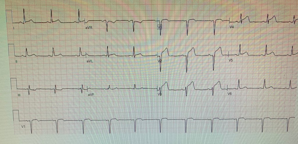 After completion of the ultrasound, cardiology arrives and the patient begins to have chest pain for the first time in the emergency department. A repeat EKG is obtained: