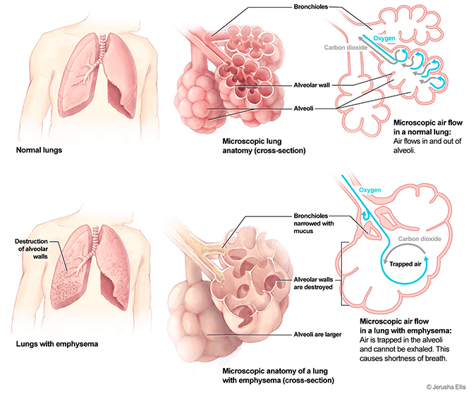 Quick pathophysiology review: “COPD is a type of obstructive lung disease in which chronic, incompletely reversible poor airflow (airflow limitation) and inability to breathe out fully (air trapping) exist. The poor airflow is the result of breakdown of lung tissue and small airways disease known as obstructive bronchiolitis”