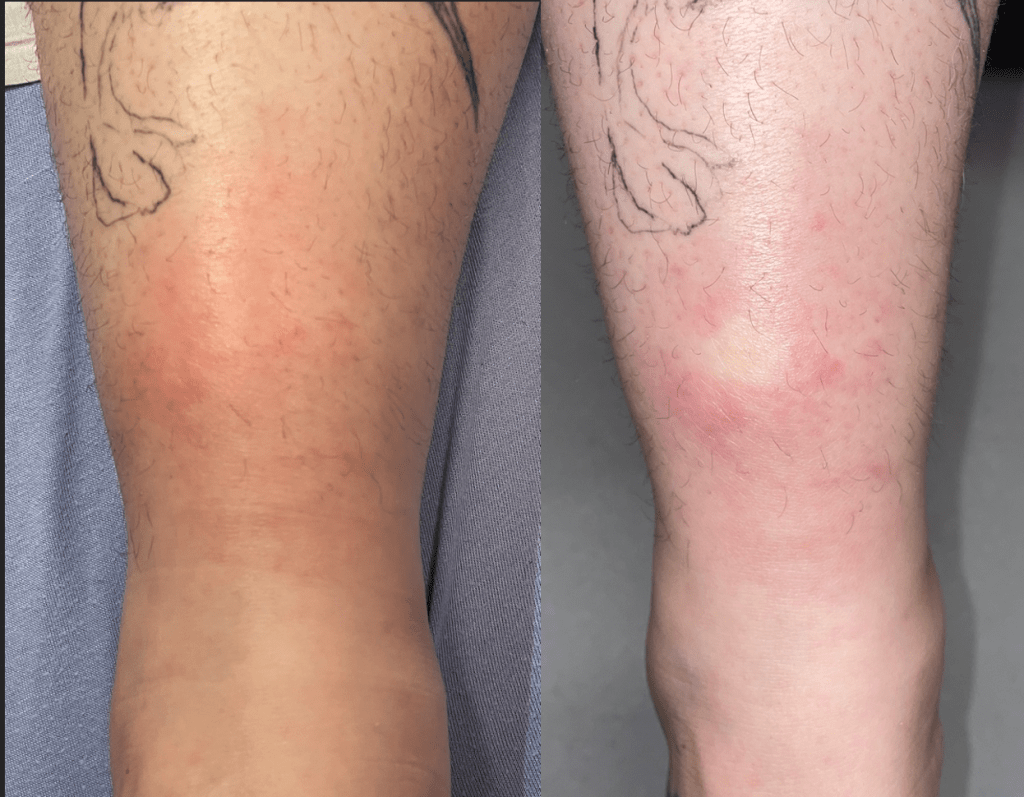 A physical exam reveals a 4cm, lesion on the right lower anterior shin. The lesion is erythematous, raised, and tender (Figure 1). Lesion is non pruritic and is blanching. (Figure 2). No other lesions are present in either lower extremity.