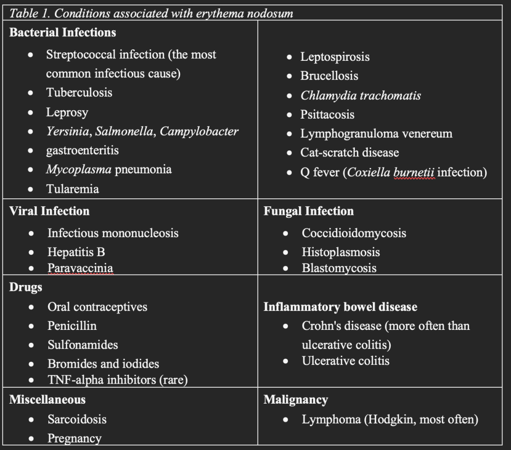 There are numerous underlying conditions that are associated with erythema nodosum (Table 1), notably sarcoidosis, tuberculosis, and most commonly streptococcal infection.